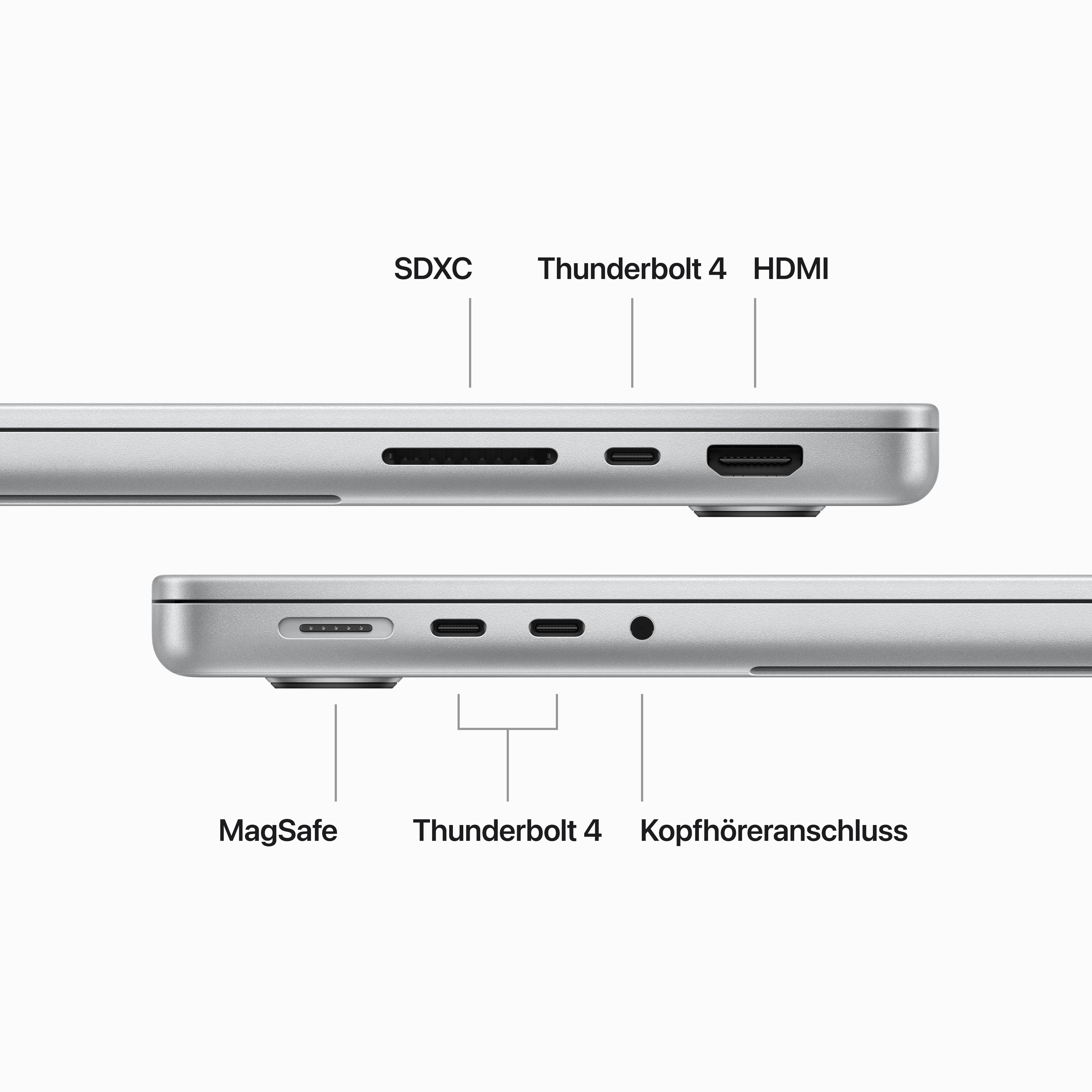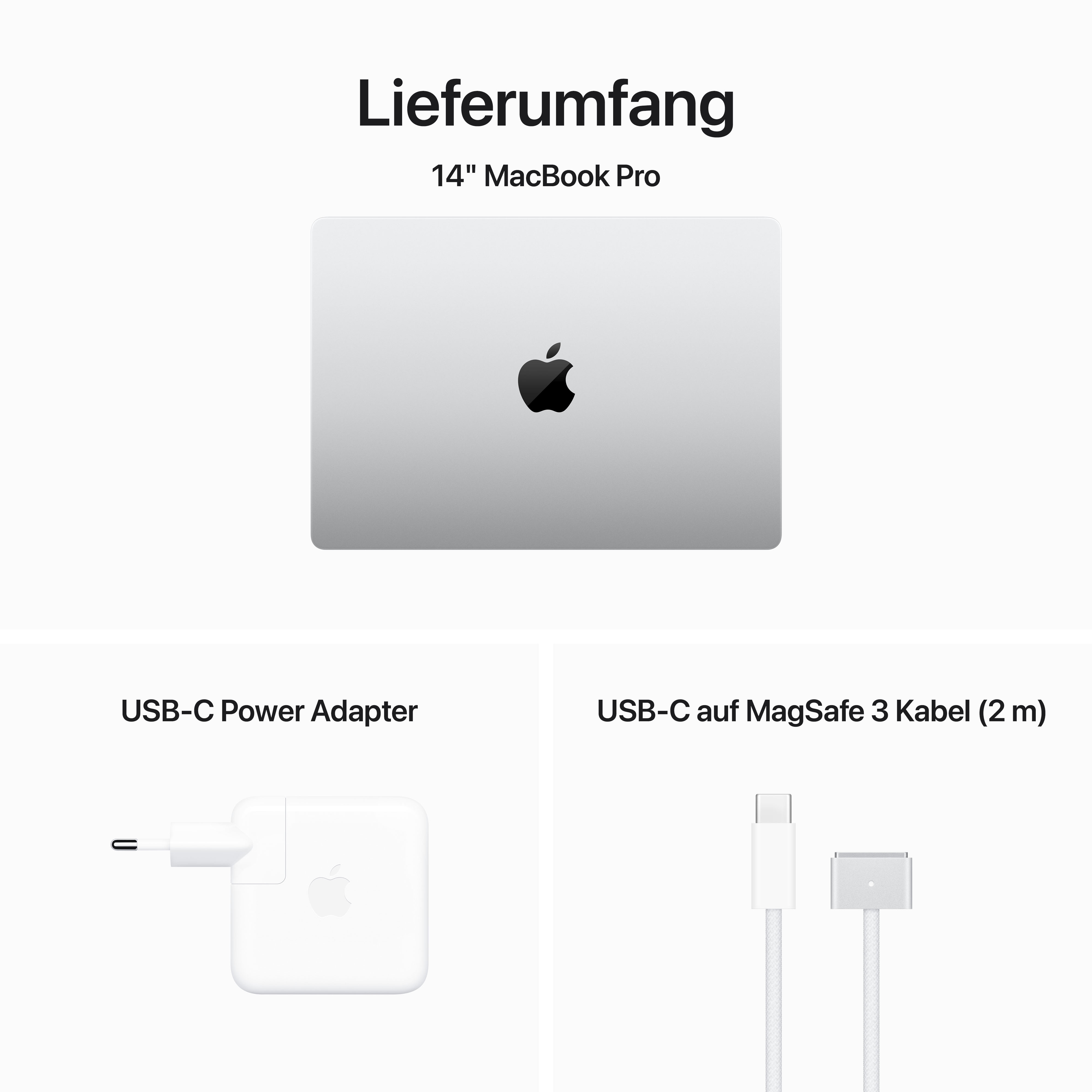 MacBook Pro. Mit der Power des M3 Pro und M3 Max. Das 14" MacBook Pro macht einen gigantischen Sprung mit den extrem fortschrittlichen M3 Pro und M3 Max Chips, die noch mehr Performance für anspruchsvollere Workflows bringen. Mit der besten Batterielaufzeit seiner Klasse – bis zu 18 Stunden1 – und einem brillanten Liquid Retina XDR Display, ist es ein Pro Laptop wie kein anderer. Jetzt in einer neuen Farbe: Space Schwarz. • MIT DER POWER DES M3 PRO ODER M3 MAX – Der Apple M3 Pro Chip liefert mit einer bis zu 12-Core CPU und einer bis zu 18-Core GPU mit Hardware beschleunigtem Raytracing eine beeindruckende Performance für anspruchsvolle Workflows wie das Bearbeiten von Gigapixel-Panoramen oder das Kompilieren von Millionen Zeilen von Code. Der M3 Max, mit einer bis zu 16-Core CPU und einer bis zu 40-Core GPU liefert extreme Performance für die fortschrittlichsten Workflows wie das Rendern komplexer 3D Inhalte oder die Entwicklung von Transformermodellen mit Milliarden Parametern. • BIS ZU 18 STUNDEN BATTERIELAUFZEIT1 – Mit dem energieeffizienten Design der Apple Chips reicht die Batterie den ganzen Tag. Das MacBook Pro liefert die gleiche außergewöhnliche Performance, egal ob es über Batterie läuft oder am Strom angeschlossen ist. • REAKTIONSSCHELLER GEMEINSAMER ARBEITSSPEICHER UND SPEICHER – Bis zu 36 GB (M3 Pro) oder bis zu 128 GB (M3 Max) gemeinsamer Arbeitsspeicher, damit alles, was du machst, schnell und flüssig geht. Bis zu 4 TB (M3 Pro) oder bis zu 8 TB (M3 Max) superschneller SSD Speicher startet Apps und öffnet Dateien sofort. 2 • BRILLANTES PRO DISPLAY – Das 14,2" Liquid Retina XDR Display3 kommt mit extremem Dynamikbereich, 1.000 Nits durchgehende Helligkeit für beeindruckende HDR Inhalte, bis zu 600 Nits Helligkeit für SDR Inhalte und Pro Referenzmodi, damit du unterwegs perfekt arbeiten kannst. • VOLLSTÄNDIG KOMPATIBEL – Alle deine Pro Apps laufen superschnell – auch Adobe Creative Cloud, Apple Xcode, Microsoft 365, SideFX Houdini, MathWorks MATLAB, Medivis SurgicalAR und viele deiner Lieblingsapps für das iPhone und iPad. 4 Und mit macOS kannst du auf deinem Mac noch besser arbeiten und spielen. Werde in Videoanrufen präsenter. Nutze neue Arten, um auf Informationen zuzugreifen. Und entdecke noch mehr Möglichkeiten, wie du deinen Mac personalisieren kannst. • FORTSCHRITTLICH BEI KAMERA UND SOUND – Mit einer 1080p FaceTime HD Kamera, einem Ring aus drei Mikrofonen in Studioqualität und einem 6 Lautsprecher-System mit 3D Audio siehst du immer großartig aus und klingst auch so. • VERBINDE ALLES – Dieses MacBook Pro hat einen MagSafe Ladeanschluss, drei Thunderbolt 4 Anschlüsse, einen SDXC Kartensteckplatz, einen HDMI Anschluss und einen Kopfhöreranschluss. Es unterstützt schnelle drahtlose Verbindungen mit WLAN 6E5 und Bluetooth 5.3. Und du kannst bis zu zwei externe Displays mit dem M3 Pro und bis zu vier mit dem M3 Max anschließen. • MAGIC KEYBOARD MIT TOUCH ID – Das beleuchtete Magic Keyboard hat Funktionstasten in voller Größe. Und mit Touch ID kannst du schnell, einfach und sicher dein Laptop entsperren und dich bei Apps und Websites anmelden. • FORTSCHRITTLICHE SICHERHEIT – Jeder Mac kommt mit Verschlüsselung, zuverlässigem Virenschutz und einem leistungsstarken Firewall System. Und mit kostenlosen Sicherheits-Updates bleibt dein Mac geschützt. • FUNKTIONIERT MIT ALLEN DEINEN APPLE GERÄTEN – Wenn du deine Apple Geräte zusammen verwendest, sind fantastische Dinge möglich. Kopiere etwas auf dem iPhone und setze es auf dem MacBook Pro ein. Nimm auf deinem MacBook Pro FaceTime Anrufe an oder sende Textnachrichten in der Nachrichten App. 6 Und das ist erst der Anfang. • GEBAUT, UM ZU HALTEN – Das Aluminiumgehäuse ist besonders robust und kommt in Space Schwarz und Silber. Kostenlose Software-Updates sorgen dafür, dass auch in Zukunft alles funktioniert. Es sind konfigurierbare Optionen verfügbar. 1Batterielaufzeit für die Wiedergabe von Filmen mit der Apple TV App. Die Batterielaufzeit variiert abhängig von Verwendung und Konfiguration. Weitere Infos unter apple.com/de/batteries . 21 GB = 1 Milliarde Byte und 1 TB = 1 Billion Byte, die tatsächlich formatierte Kapazität ist geringer. 3Das Display des 14" MacBook Pro hat oben gerundete Ecken. Als Standard-Rechteck gemessen hat das Display eine Diagonale von 14,2" (35,97 cm). Der tatsächlich sichtbare Displaybereich ist kleiner. 4Apps sind im App Store erhältlich. 5WLAN 6E ist verfügbar in Ländern und Regionen, in denen es unterstützt wird. 6Erfordert iCloud und eine Internetverbindung. Technische Daten Eine vollständige Liste gibt es auf apple.com/de/macbook-pro/specs