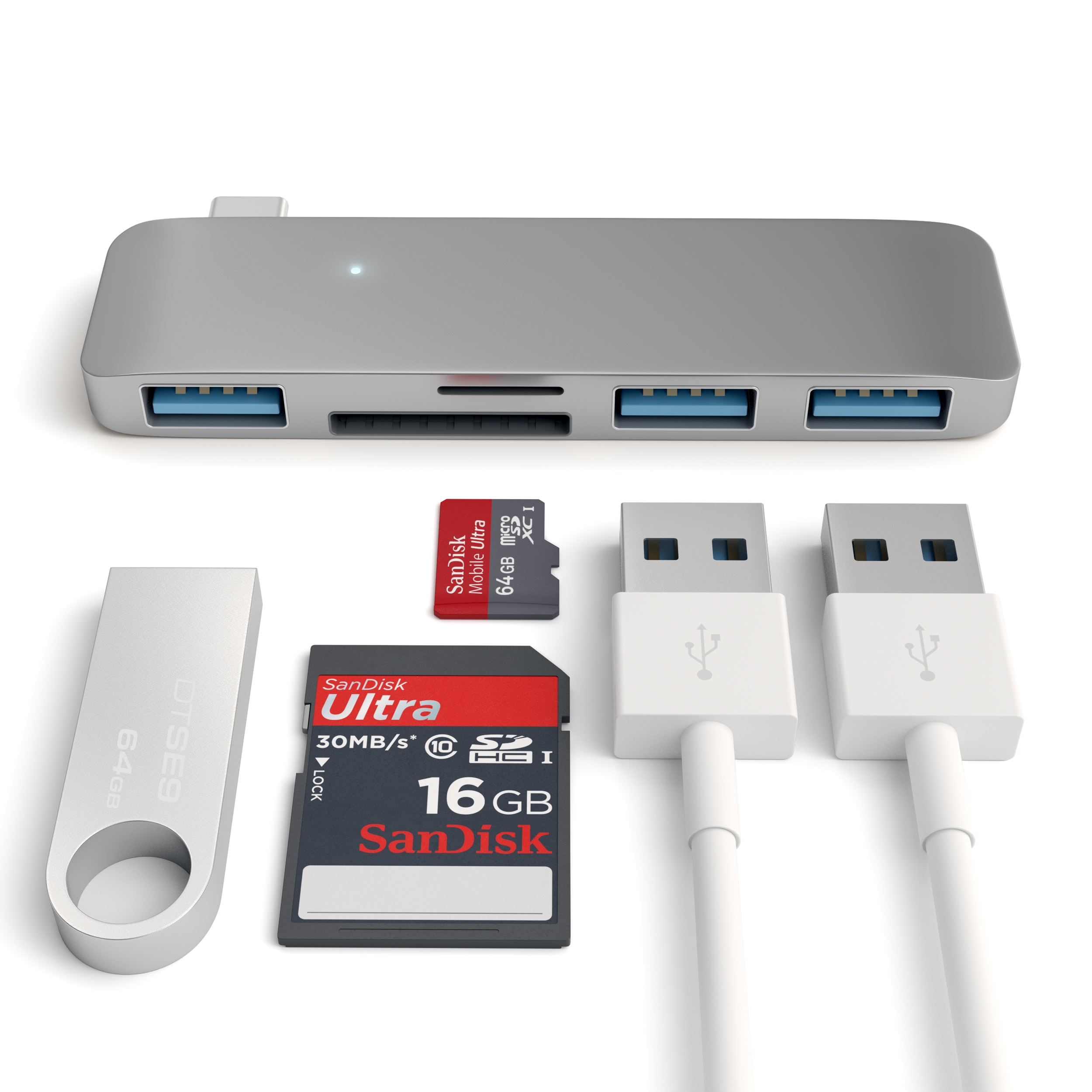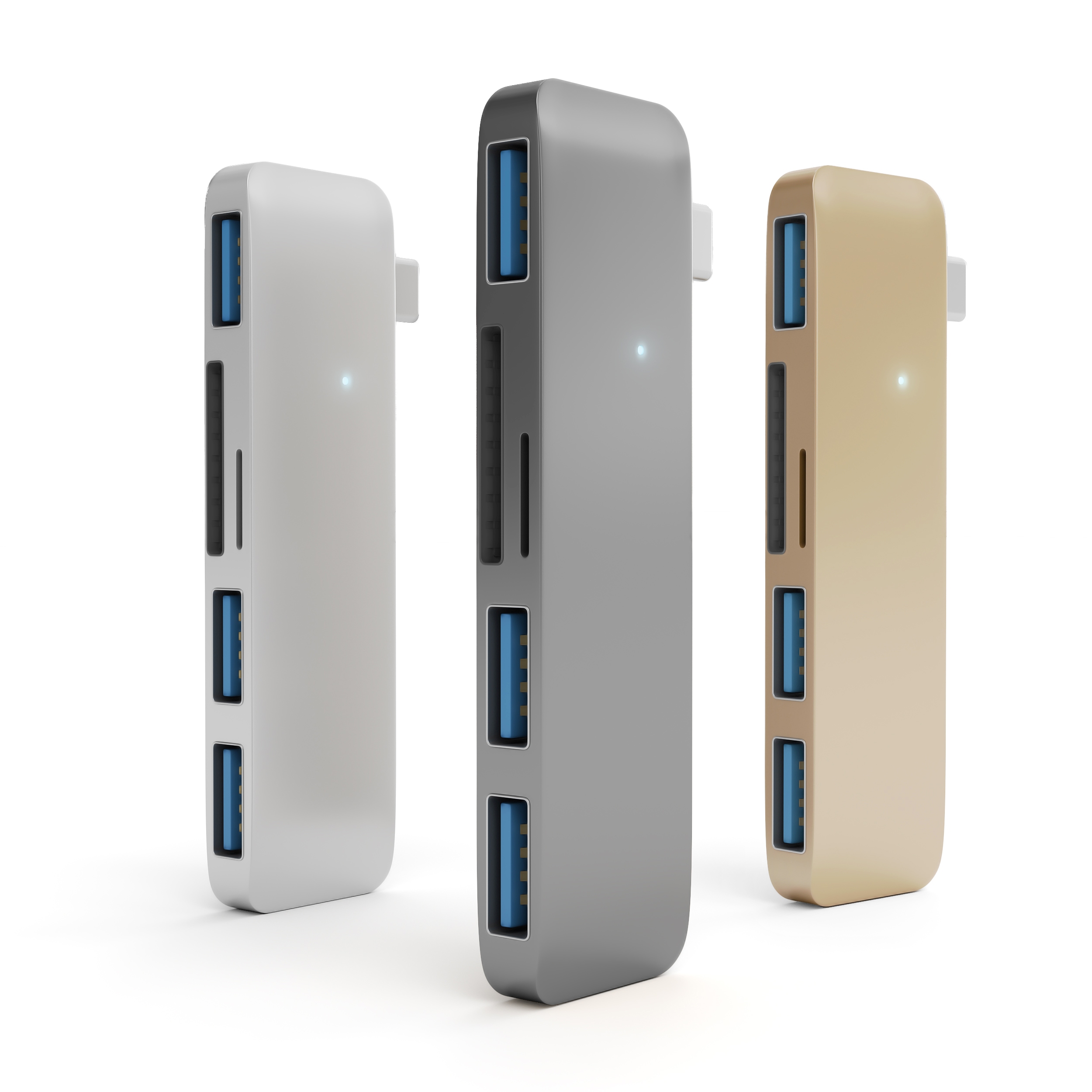 Der Type-C USB Hub von Satechi erweitert das MacBook um eine Vielzahl an Anschlussmöglichkeiten. Drei USB-3.0-Buchsen und jeweils ein Steckplatz für eine SD- und Micro-SD-Speicherkarte ermöglichen eine schnelle Datenübertragung und den Anschluss verschiedener Peripheriegeräte. Passgenau gefertigt für das MacBook 12 Zoll, aber auch kompatibel mit MacBook-Pro-Modellen ab 2016.