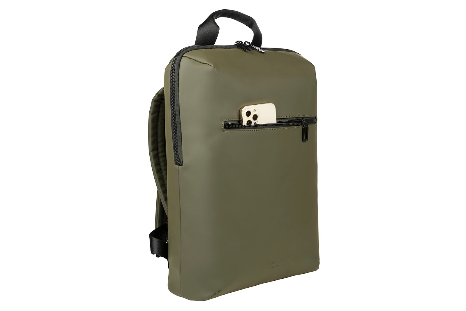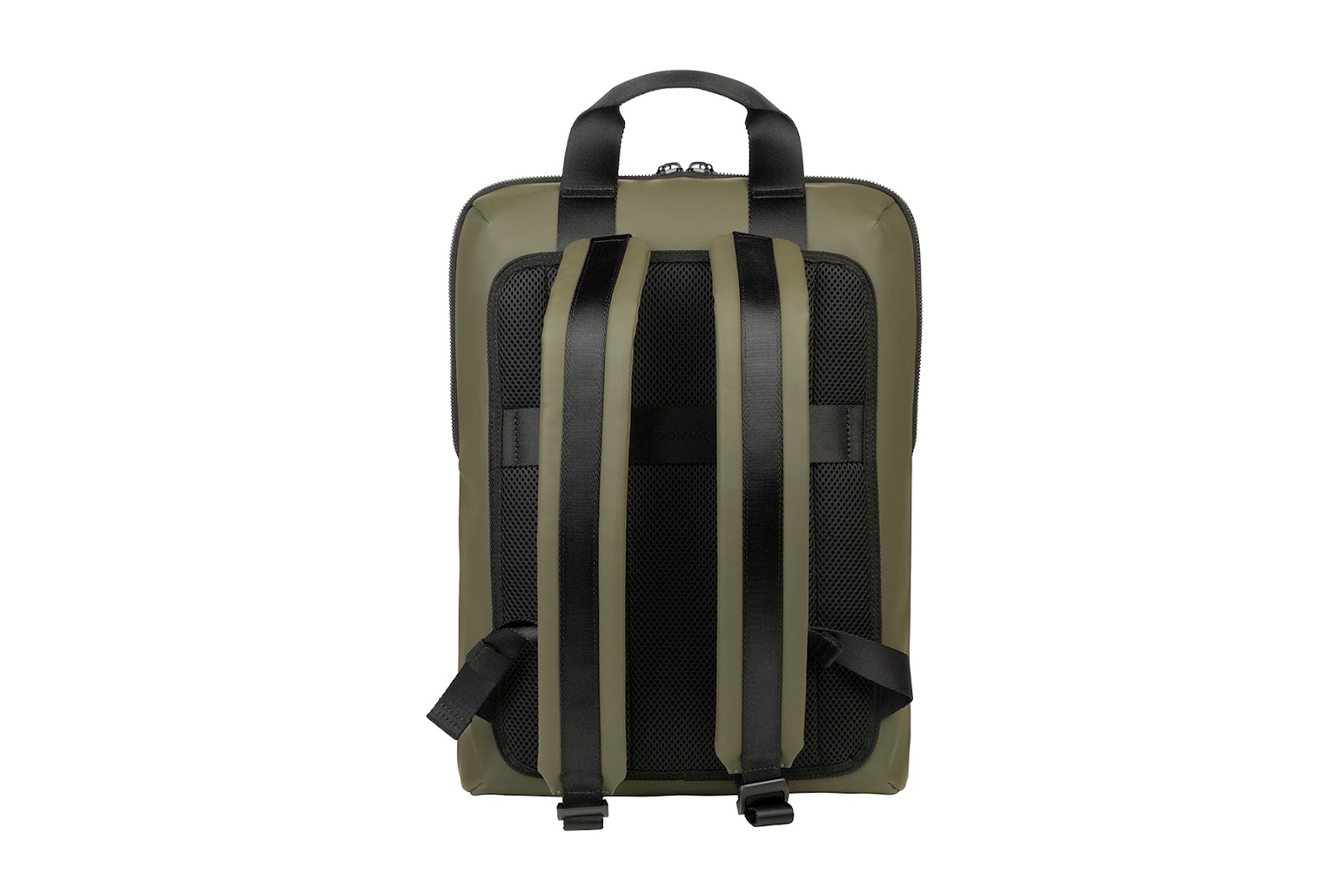 - Wasserfestes, recycletes Kunststoff mit gummierter, matter, angenehmer Oberfläche - Für Laptop 15.6 Zoll und MacBook Pro 16 Zoll (2019-2023), Macbook Air 15 Zoll - Befestigungsgurt für den Trolley - Externe Tasche für Zubehör - Atmungsaktive Netzrückenlehne Die Gommo-Taschen- und Accessoires-Linie besteht aus einem Material, welches aus recyceltem Kunststoff hergestellt wird, und zeichnet sich durch ein minimalistisches Design aus. Das Design besticht durch weiche Linien und markante Farbtöne. Das wasserfeste Material verfügt über eine matte Oberflächenbehandlung, die der Kollektion eine besondere, einzigartige Note verleiht. Rucksack mit minimalistisch-sportlichem Design für 15,6"Laptops und 16" MacBooks, aus gummiertem Material. Ausgestattet mit einem großen Fach verfügt der Gommo-Rucksack über eine Innentasche für Laptops und eine Außentasche für Zubehör sowie einen atmungsaktiven Netzrücken mit angebrachtem Trolley-Gurt.