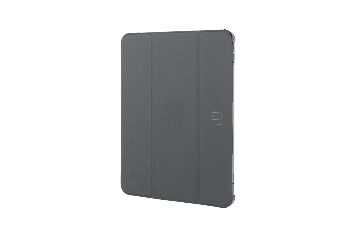 Ultra-Schutzhülle für iPad, teilweise aus recyceltem Kunststoff, mit satinierter Vorderseite, umwandelbar in eine aufrechte Position. Die stoßfeste Rückseite besteht aus transparentem, doppelt gespritztem Polycarbonat, ergänzt durch einen TPU-Rand, der das Einsetzen des iPads erleichtert. Die Satin-Hülle ist mit einem Innenfach für den Tucano Pencil und Apple Pencil ausgestattet. Nach Militärstandard zugelassen.