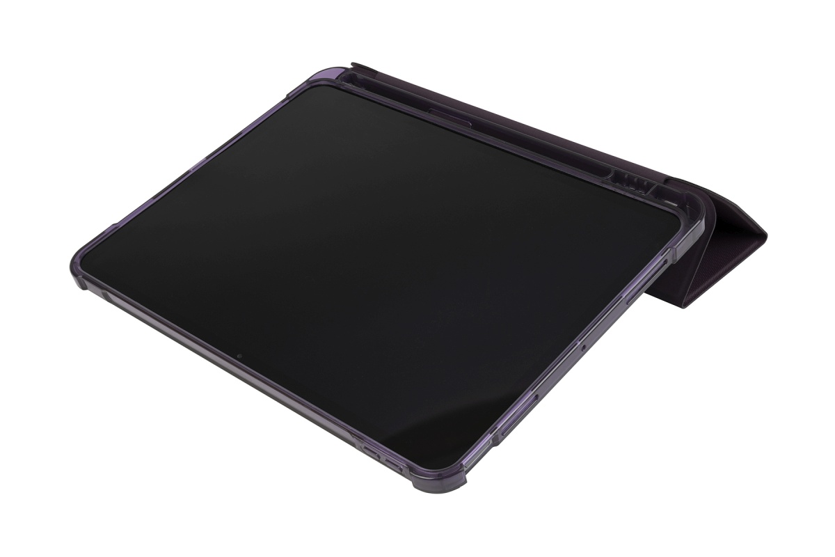 Ultra-Schutzhülle für iPad, teilweise aus recyceltem Kunststoff, mit satinierter Vorderseite, umwandelbar in eine aufrechte Position. Die stoßfeste Rückseite besteht aus transparentem, doppelt gespritztem Polycarbonat, ergänzt durch einen TPU-Rand, der das Einsetzen des iPads erleichtert. Die Satin-Hülle ist mit einem Innenfach für den Tucano Pencil und Apple Pencil ausgestattet. Nach Militärstandard zugelassen.